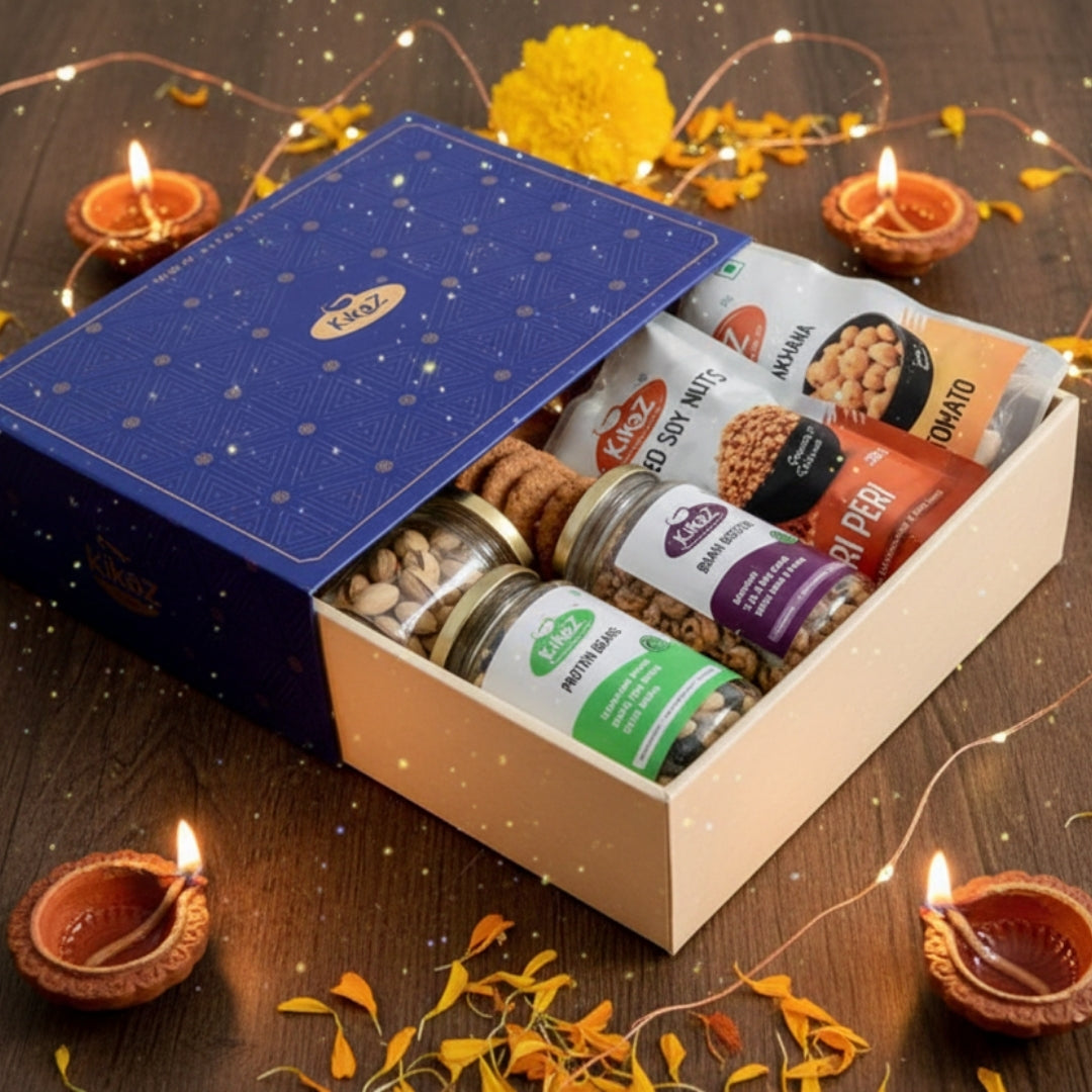 Dive into the festive spirit with the Kikaz Grand Diwali Gift Hamper, a perfect blend of health and indulgence. Packed with our signature roasted soy nuts, nutrient-rich seeds, and crunchy snacks, this hamper is designed to bring joy to your celebrations without compromising on wellness. Whether it’s for family or corporate gifting, make this Diwali special with Kikaz – where taste meets health.